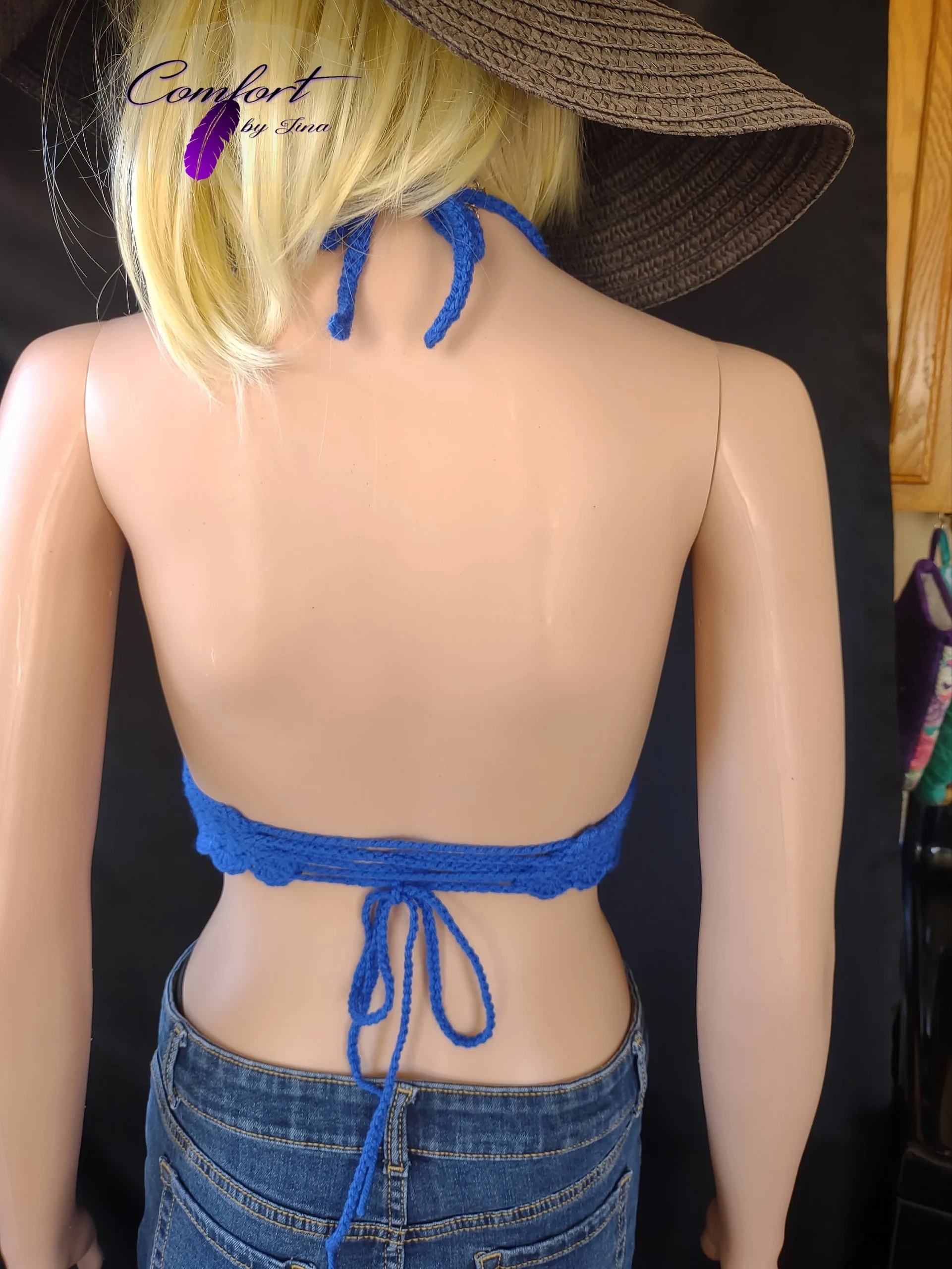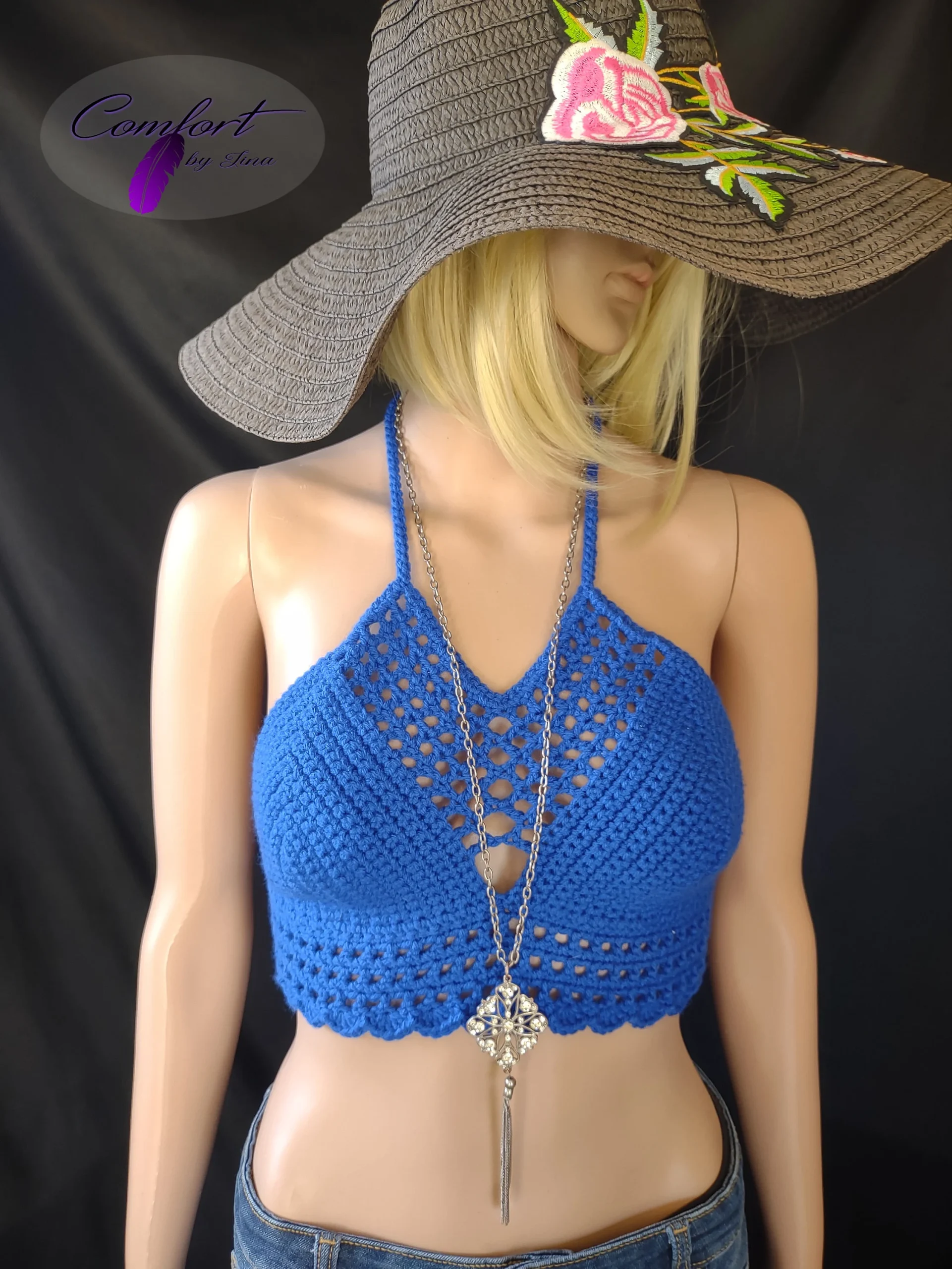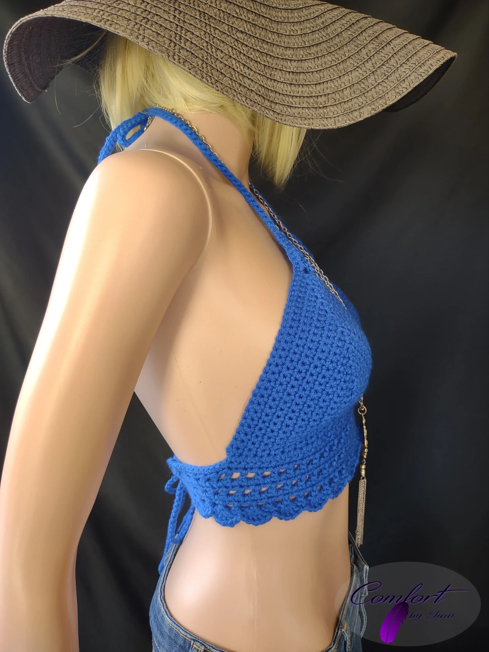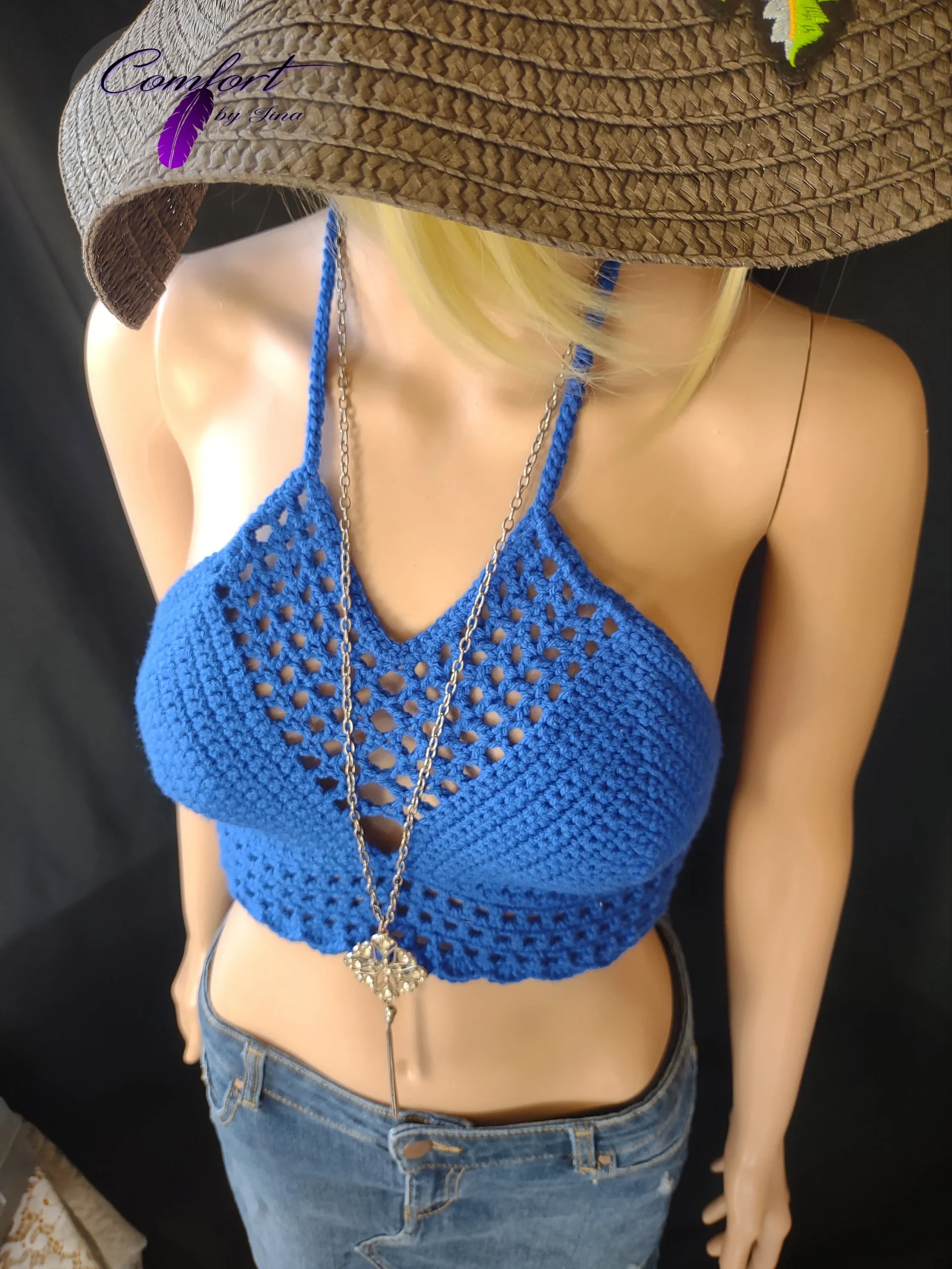 Crop top with a caged neckline for a unique style and an open back, finished with a shell pattern at the bottom. Perfect for catching for a nice breeze on a summer day.