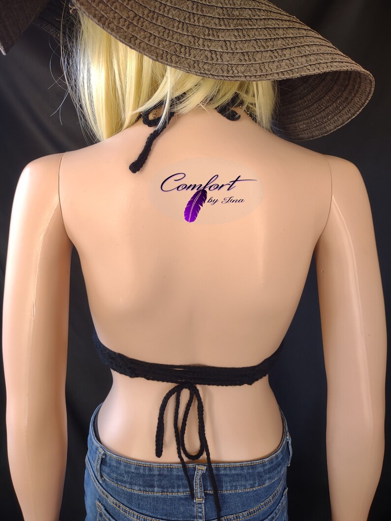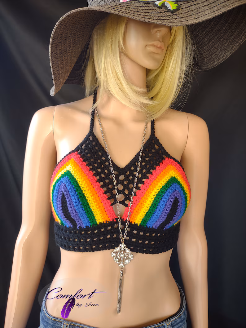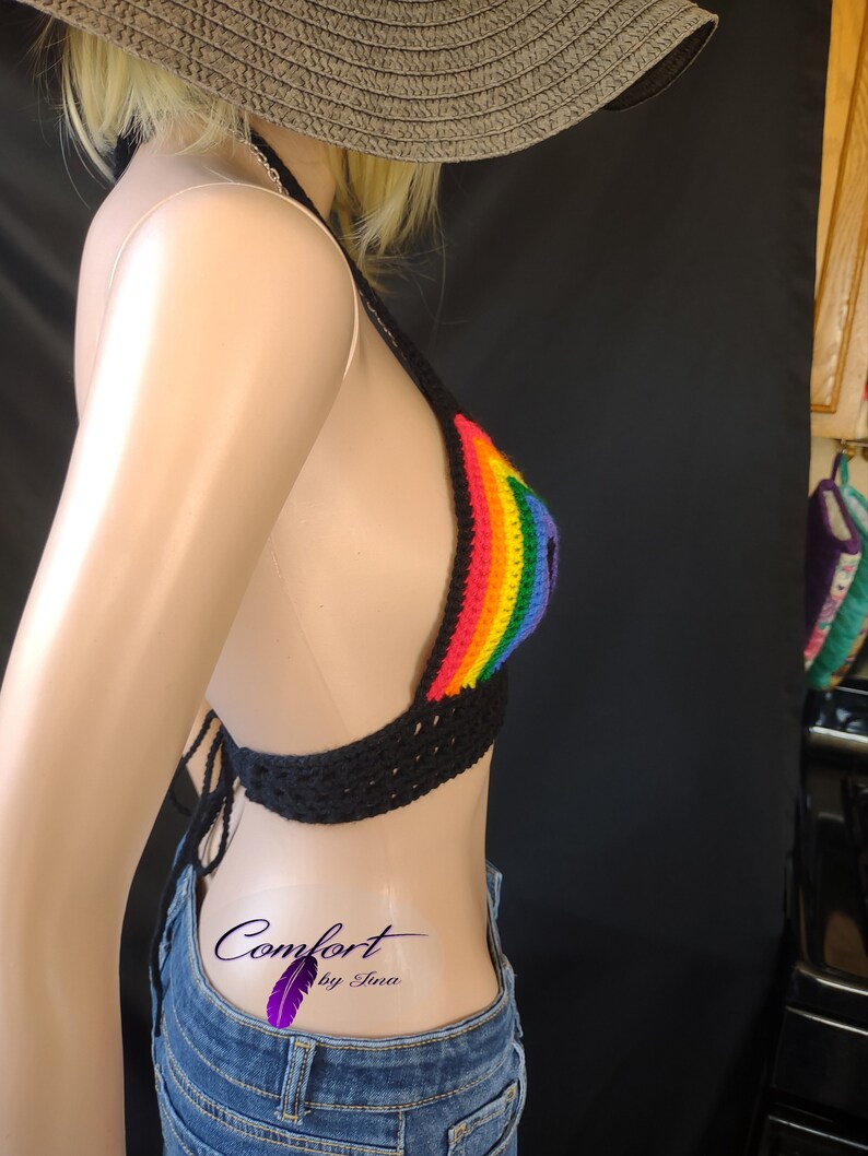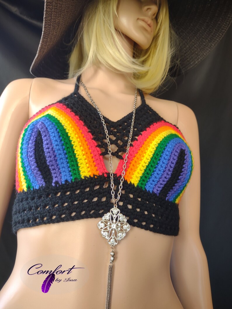 Black Rainbow crop tops are made with 100% Acrylic yarn and feature caged necklines and an open back. Great for a warm day when you want to look your best!