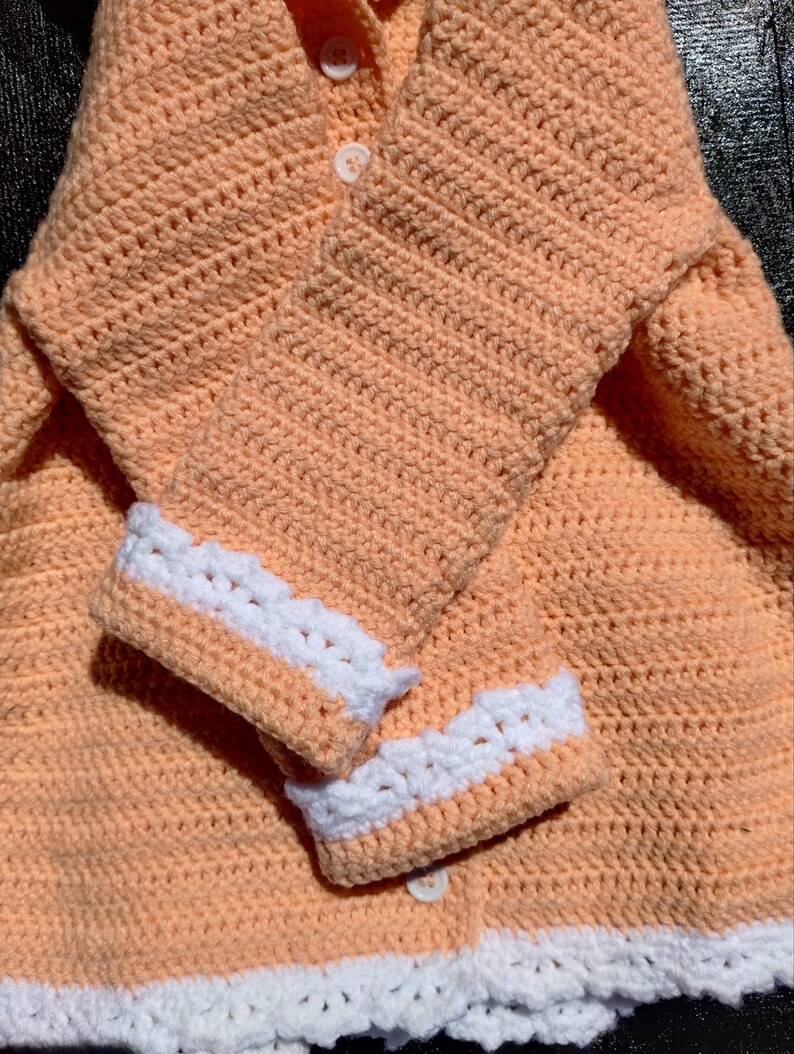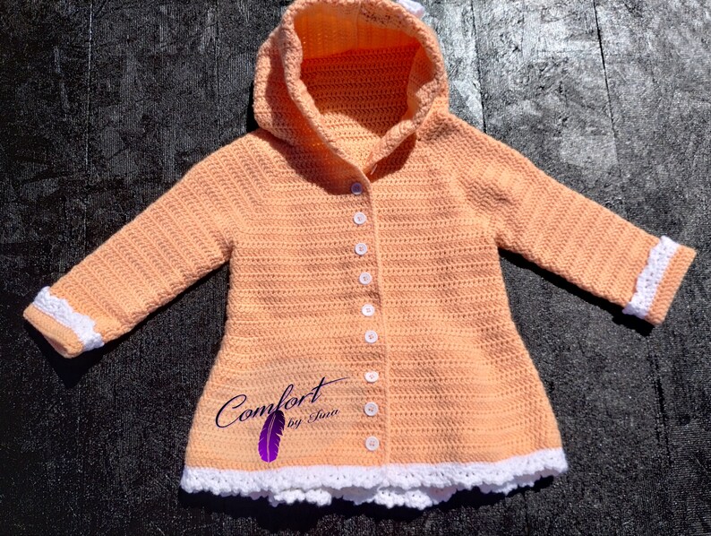 This cute cardigan is sure to keep your little one nice and warm. This cardigan features a hood that has three flower appliques and a flowered hem design. Note: Cardigan is for sizes 4/5 girls