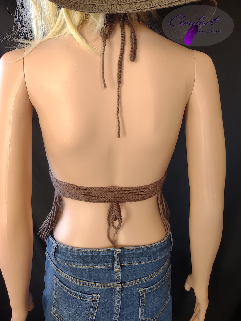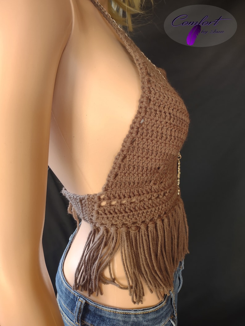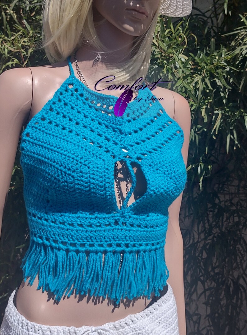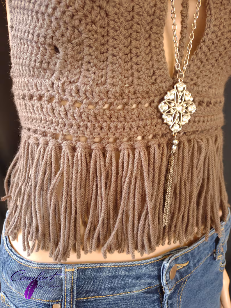 Crochet halter top with a fringe bottom and an open back. 100% acrylic yarn.