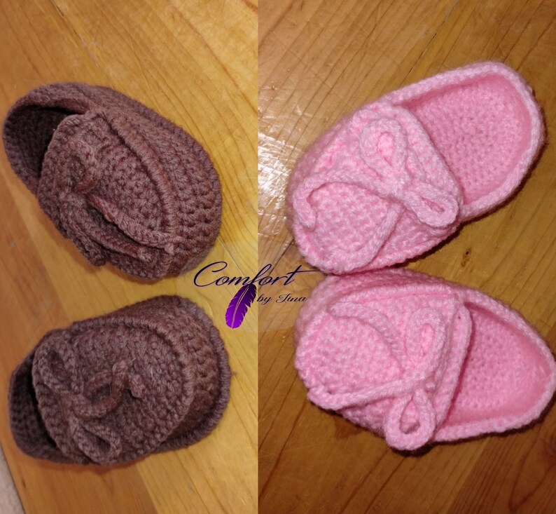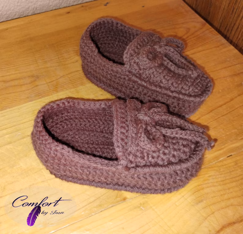 These baby sized loafers are made with a soft acrylic baby yarn. Sturdy and adorable, these loafers are made to hold up and not irritate your baby’s skin. Two sizes available: Small is for Infants 6 months to 1 year, and Medium is for Toddlers 1-2 years.