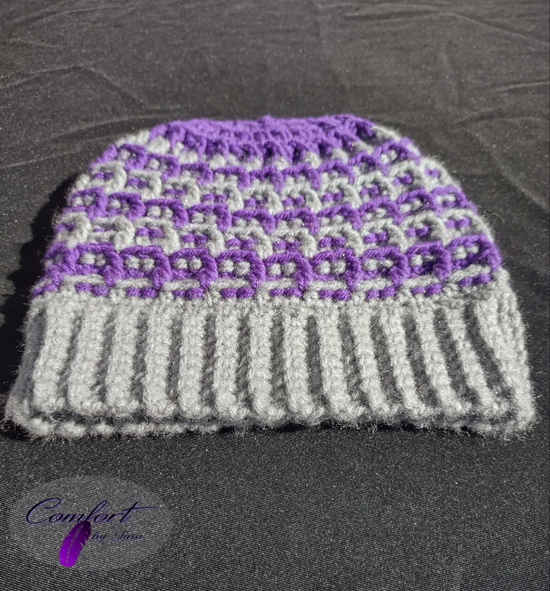 This handmade crochet beanie will keep your head warm on those cold mornings or nights. The waffle stitch gives it a little extra texture and thickness for more warmth. Made with acrylic yarn. Machine washable!